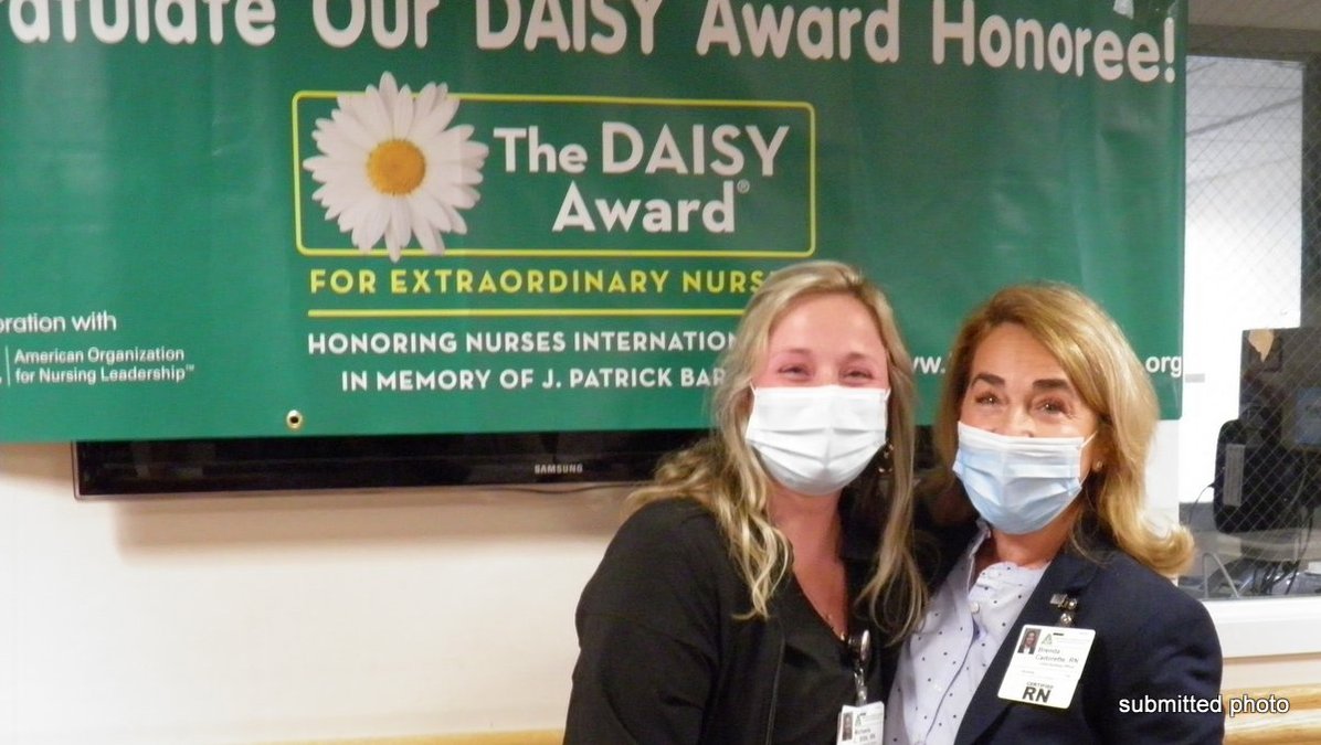 Michaela LaPlante, left, a registered nurse at Berkshire Medical Center receives the latest DAISY Award for Extraordinary Nurses from BMC Chief Nursing Officer Brenda Cadorette. |