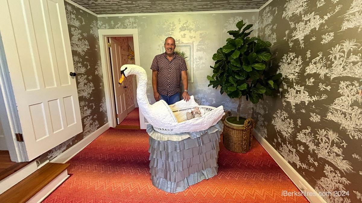 Harry Heissmann of Harry Heissmann Inc's room "Swam Lullaby" greets guests with a large paper mâché bassinet shaped like the majestic bird. He was inspired by a local news article about mute swan sightings.